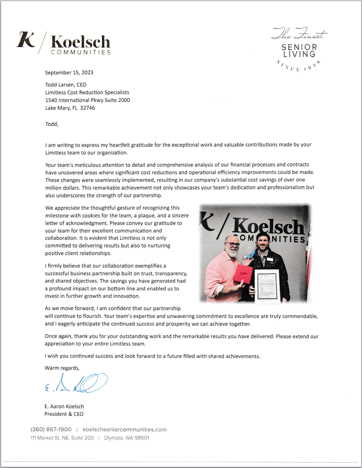“It is my pleasure to relay to you the value that Limitless has provided to Koelsch Communities not only in regard to tangible and measurable cost reductions, but also in the areas of confidence in our accounts payable process and the ease of visibility into our monthly spend in several important areas across all our communities.”